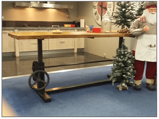 Industriële in hoogte verstelbare Crank tafel. Deze tafel is naar hoogte te verstellen door middel van een handwiel naar een hoogte van 114cm.