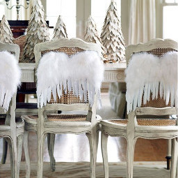 Stoelen kun je ook decoreren: hang aan de achterkant een mooie strik of kleed ze voor de gelegenheid aan met een andere stoelhoes. Met wat lint, stof, wintergroen, dennenappeltjes en versiering in de kleuren van je kerstboomversiering maak je je kerststoel helemaal af. Ook leuk voor een sneeuwwit thema: engelenvleugeltjes aan de rug van je stoel. Het belangrijkste is natuurlijk dat je met de versieringen wel lekker kunt zitten.