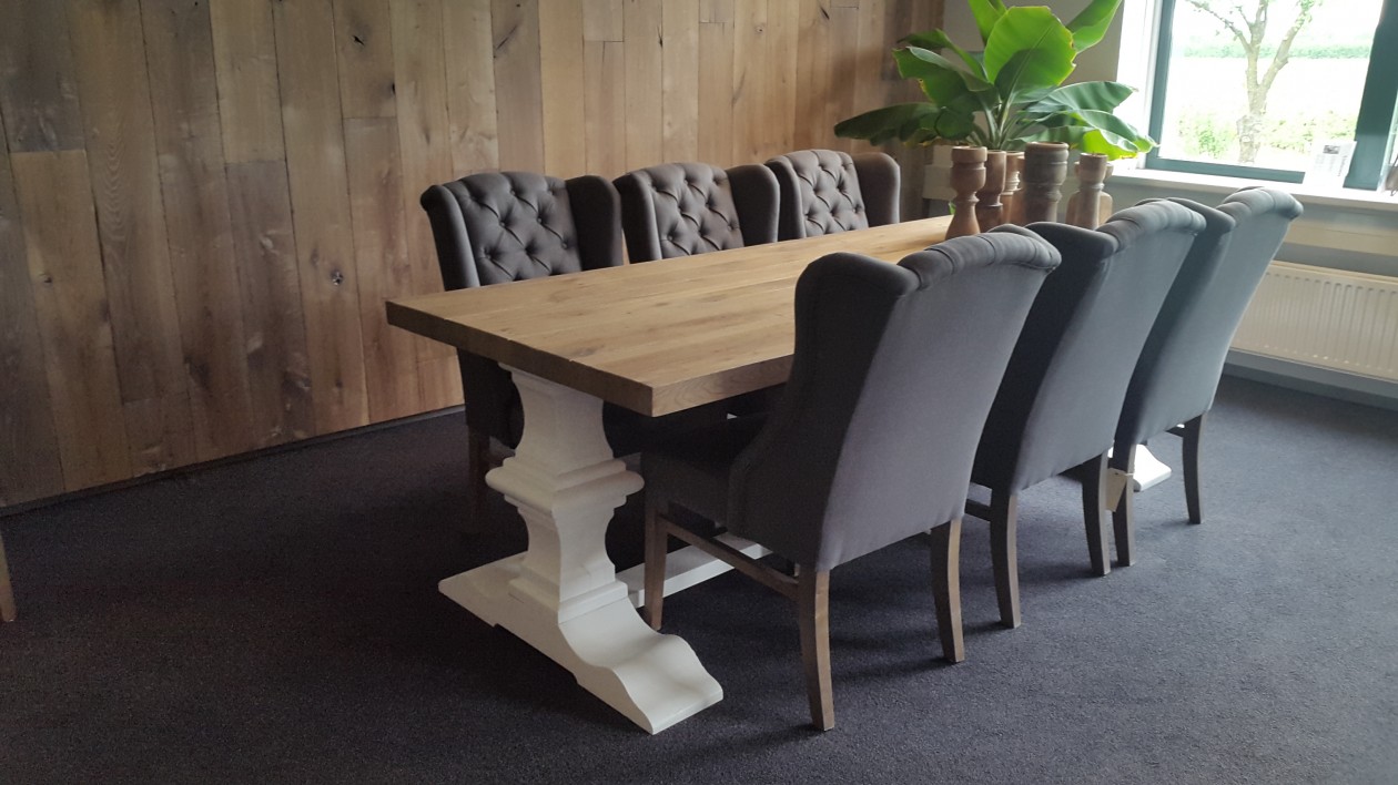 Daarnaast kunt u ook helemaal uw eigen kleur en afwerking kiezen, zo is het mogelijk om de tafel in bijvoorbeeld white wash, naturel, zwart, grijs, bruin en nog veel andere kleuren af te werken. Ook kunt u hierbij kiezen om de tafel helemaal in 1 kleur af te werken of met een andere kleur poten, zoals witte poten en zwarte poten.