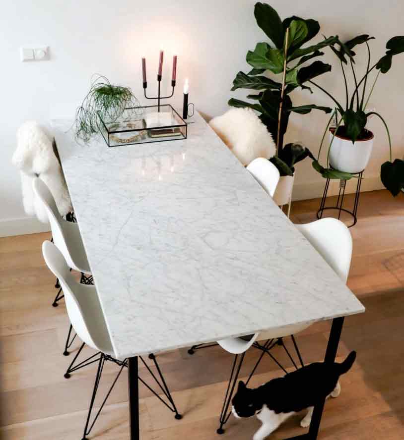 De materialen waaruit eettafels worden gemaakt hebben allen hun unieke eigenschappen, voordelen en soms ook nadelen. Het is belangrijk om goed te bedenken van welk materiaal u uw eettafel wilt hebben. Een houten tafel past door zijn natuurlijke uitstraling in elk interieur. Hout is ook eenvoudig te matchen met diverse kleuren eetkamerstoelen. Nadeel van een houten tafel is dat elke houtsoort zijn eigen onderhoud vergt. Een eettafel van MDF komt qua uitstraling zeer dicht in de buurt van een houten eettafel. Qua prijs is MDF een stuk voordeliger dan bijvoorbeeld een eiken tafel. MDF is wel gemakkelijk te voorzien van een nieuwe kleur. MDF tafelbladen zijn vrij kwetsbaar en laten sneller krasjes zien dan bladen van andere houtsoorten. Heeft uw interieur een industriële look dan kunt u ook denken aan een eettafel van metaal, eventueel in combinatie met hout. Een metalen eettafel vergt, mits hij goed bewerkt is, weinig tot geen onderhoud. Marmeren eettafels winnen in een hoog tempo aan populariteit. Niet raar, want marmer geeft uw interieur een rijke en natuurlijke uitstraling. Marmer is een uniek natuurlijk materiaal en geen enkele eettafel ziet er hetzelfde uit. Marmeren eettafels zijn verkrijgbaar in diverse kleuren. Denk daarbij aan Nero Marquinqa zwart, Carrara wit, India groen, Dark emperador bruin, Port barton goud en CremaMarfil.