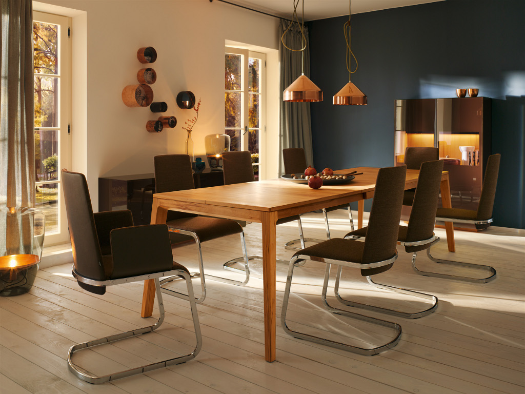 Zijn vrouwelijke dynamiek haalt deze uittrektafel uit het gelijklopende onderstel en de vloeiend in de lijsten overlopende, smaller wordende tafelpoten met afgeronde kanten. De drielagige platentechnologie van TEAM 7 laat tegelijk met de allergrootste stabiliteit en vormvastheid een elegante, slanke uitvoering toe van het tafelblad. Ook de moderne, dwarse nerfrichting is met natuurhout alleen door deze technologie mogelijk. Zowel technisch als visueel overtuigt mylon in elk formaat. In een kleine uitvoering oogt mylon door zijn fijne afmetingen zeer evenwichtig, bij grote modellen komt door de uitlopende tafelvoet zijn enorme spanbreedte des te indrukwekkender over.