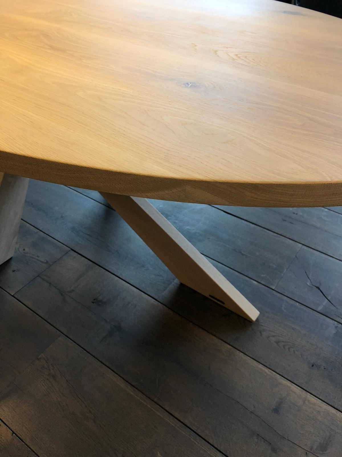 Deze ovale eettafel heeft een houten kruispoot. Deze is gemaakt van hetzelfde eiken hout als het blad.