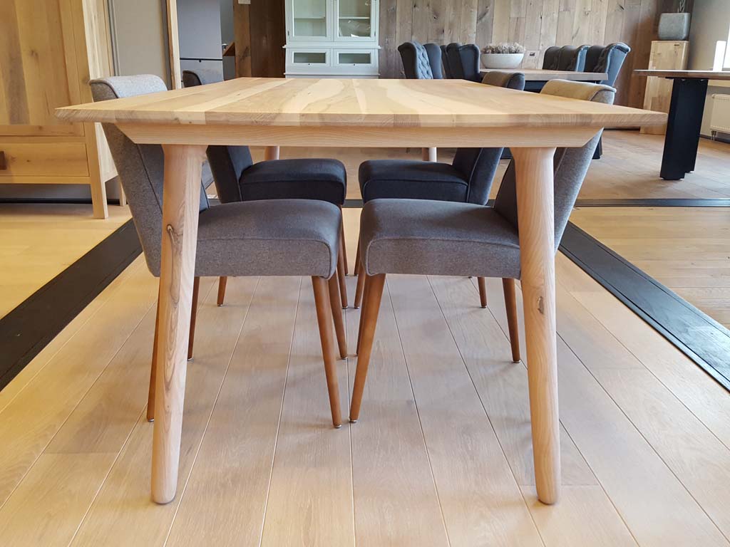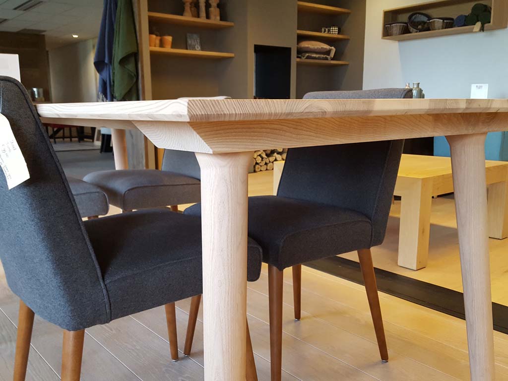 Het houten blad komt bij deze tafel heel mooi naar voren. Wij leveren deze daarom in 2 verschillende houtsoorten: Europees eiken met noesten en Essen hout. Dit Essen hout (zoals op de foto) heeft een hele bijzondere nerven structuur met prachtige tekeningen. Hierdoor is deze tafel echt een bijzonder object in huis!