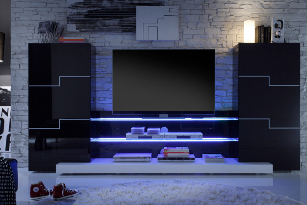 Door een stijlvolle hoogglans afwerking in hoogglans zwart en een enorme opslagcapaciteit, is dit wandmeubel een absoluut hoogtepunt in jouw woonkamer. Twee stevige legplanken van veiligheidsglas zorgen voor een optimale presentatie van jouw tv/ – dvd/ of audioaccessoires. Het elegante ontwerp in combinatie met glas, hoogglans witte en zwarte elementen maken dit wandmeubel een echte eyecatcher. Voor het upgraden van het Twin wandmeubel is het mogelijk om ledverlichting voor de glazen rand bij het meubel te bestellen. Ook is het mogelijk om een extra topplank te bestellen die voor meer opbergruimte voor accessoires biedt.