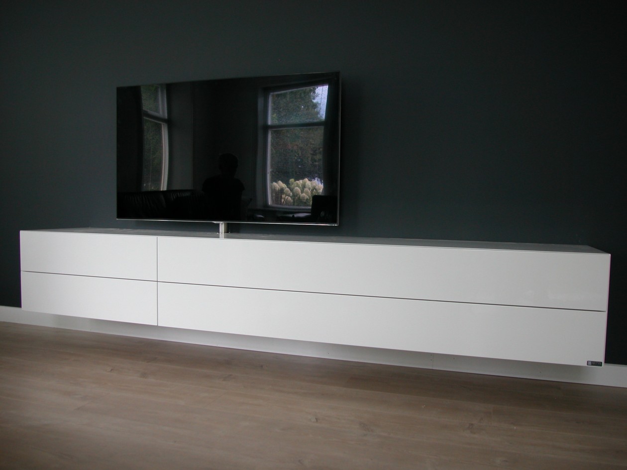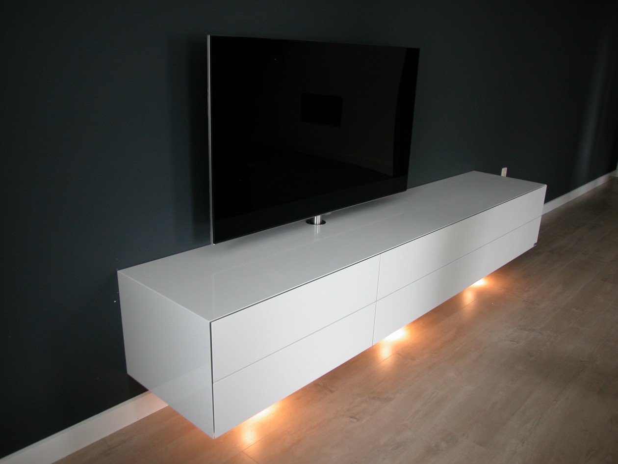 tv-meubel ALPHA zwevend gemonteerd en voorzien van tv ophanging dmv het ARTYX tv-draaisysteem met kabeldoorvoer. De hoogglans kast kan tevens in zijdeglans of super matte lak gespoten worden. Dit meubel is op maat gemaakt in de meubelmakerij van ARTYX en leverbaar in iedere afmeting en kleur