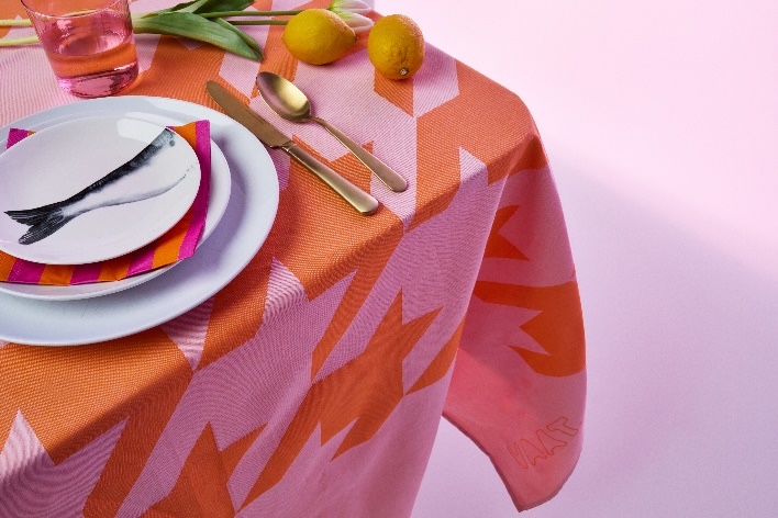 Het Amsterdamse label VAAT brengt in navolging van een serie kleurrijke fashionable thee- en keukenhanddoeken een signature tafellaken in roze oranje XL pied-de-poule dessin.