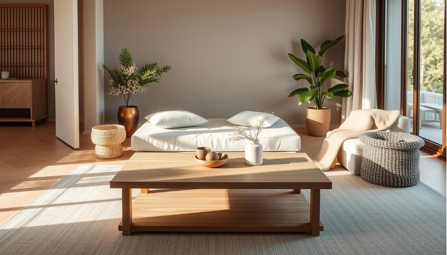 A serene interior space showcasing Japandi design, featuring a low-profile, minimalist coffee table made of light wood, surrounded by natural textures and neutral color palettes, with soft lighting tips and cozy greenery accents, emphasizing harmony between Japanese and Scandinavian aesthetics.