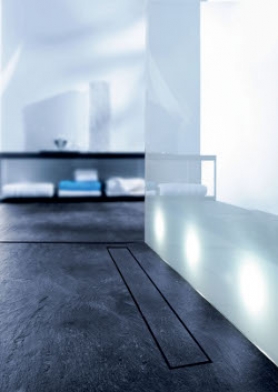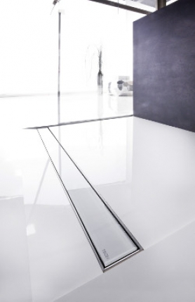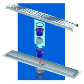Een serie roestvrijstalen douchegoten van Van den Berg afvoerputten met een wel zeer opmerkelijk detail: een uitneembaar watervrij reukslot. Het reukslot heeft een kunststof behuizing met een rubber, zelfsluitend membraam.
