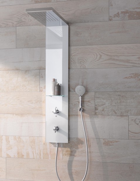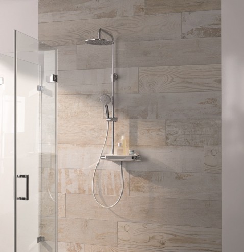 Alles-in-één douchesysteem ‘Shower System Shelf 1050’ overtuigt door zijn tijdloze design, individueel aanpasbare douchemogelijkheden en praktische opbergruimte.