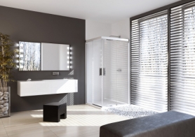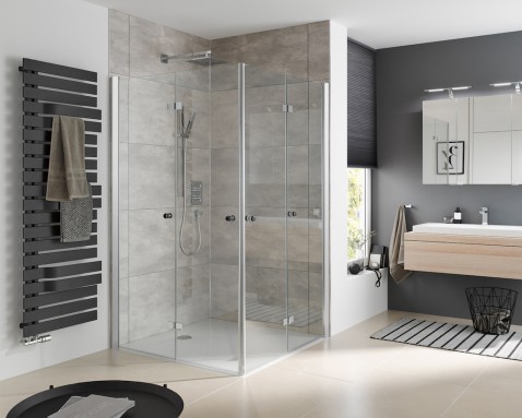 De Edina schuifdeurenserie voor douchecabines past door het ruimtebesparende concept in iedere badkamer. Daarnaast zorgt de constructie ervoor dat al het water daadwerkelijk binnen de cabine blijft.