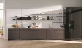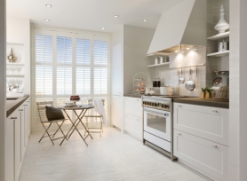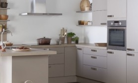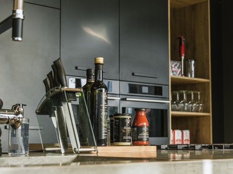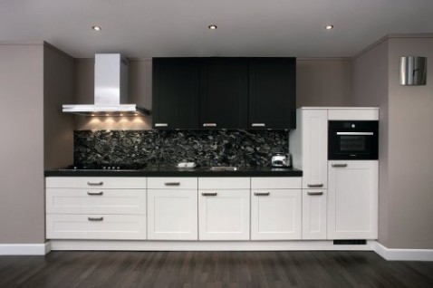 Spelen met sferen en kleuren geeft soms verrassende resultaten. De kaderdeuren in deze opstelling zijn uitgevoerd in wit en zwart. Door deze twee contrasterende kleuren te combineren krijgt de keuken