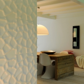 Wat ooit als afval na de productie van rietsuiker werd verbrand, wordt tegenwoordig als grondstof gebruikt bij de vervaardiging van deze zeer hippe en moderne 3d-wandpanelen.