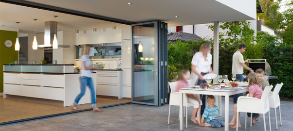 | Glazen vouwwanden van Solarlux voegen een extra dimensie toe aan je woning. Je woning en tuin worden één. De wanden kunnen volledig geopend worden en vormen een naadloze overgang van binnen naar buiten en andersom. |