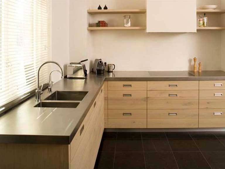 Een hoek-keukenblad van rvs, volledig op maat gemaakt. Uit één stuk of verschillende breedtes.
