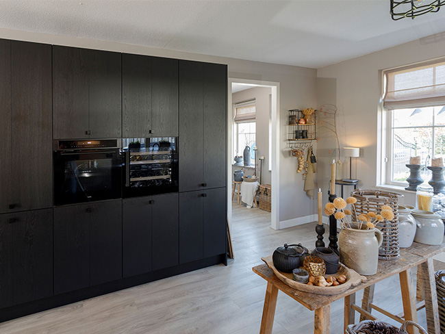 In een sfeervolle woning komt deze moderne landelijke droomkeuken prachtig tot zijn recht. Met matzwarte eiken fronten, een lichtgrijs aanrechtblad en stijlvolle accessoires voor een warm geheel.