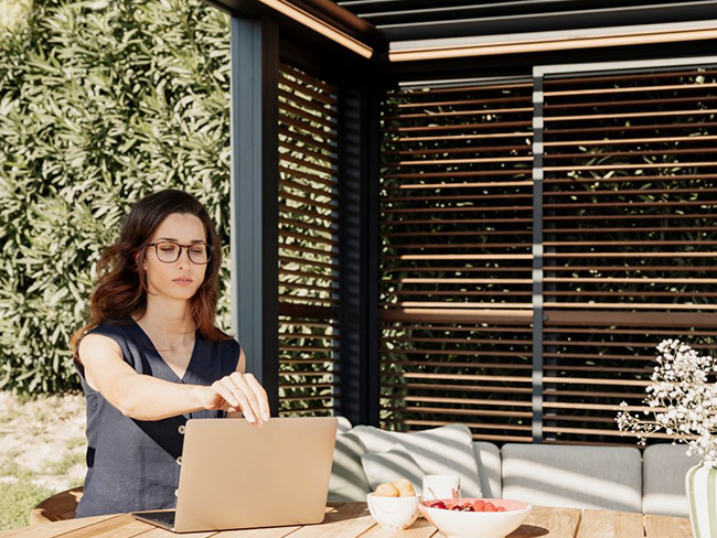Werk buiten onder je Renson Camargue voor meer creativiteit, minder stress en comfort in elk seizoen. Van thuiskantoor tot relaxplek, jouw tuin wordt multifunctioneel.