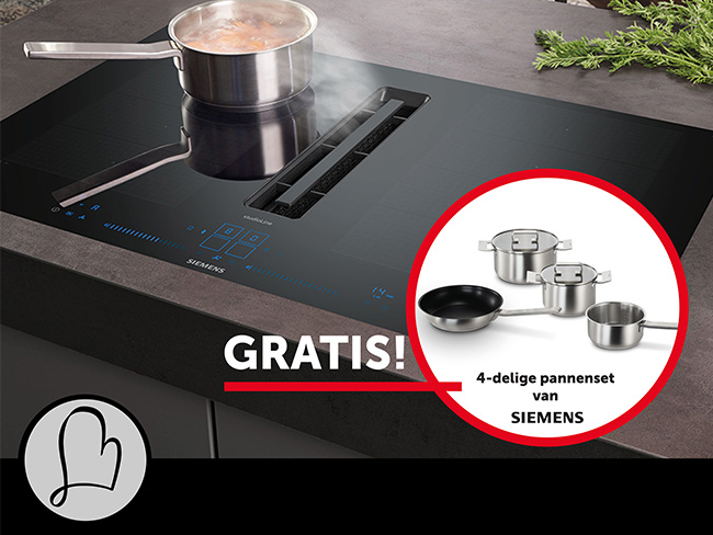 een Keukenspecialist in de buurt een Siemens pannenset bij aanschaf van een nieuwe keuken met minimaal 4 Siemens inbouwapparaten, waarvan één deelnemende kookplaat met geïntegreerde afzuiging.* | | Bekijk deze actie | | |