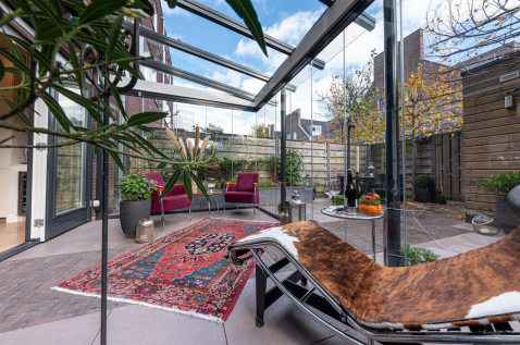 De perfect sluitende glazen panelen zijn - als de omstandigheden zich hiervoor lenen - volledig wegklapbaar en in één hoek te plaatsen. De enkele, verzonken rail zorgt voor een onbeperkte doorgang. De glazen draai-/vouwsystemen bestaan uit oersterk en gehard veiligheidsglas en zijn bestand tegen windkracht 12.