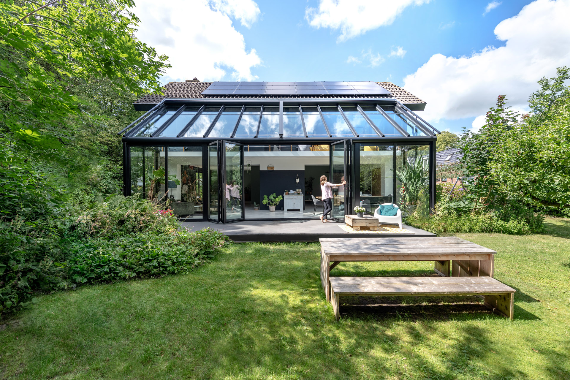 In deze tijden is het belangrijk om van je huis een thuis te maken. Met een serre haal je veel daglicht in huis. De glazen vouwwanden onder het serredak zorgen dat je de ruimte over de gehele breedte kunt openen. De zon vormt een natuurlijke bron van energie en warmt de woonkamer lekker op. En wordt het zomers te warm, dan kan er via kiepramen aan de bovenzijde geventileerd worden en biedt zonwering de gewenste schaduw.