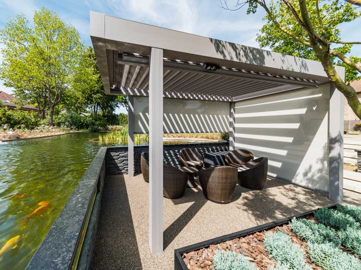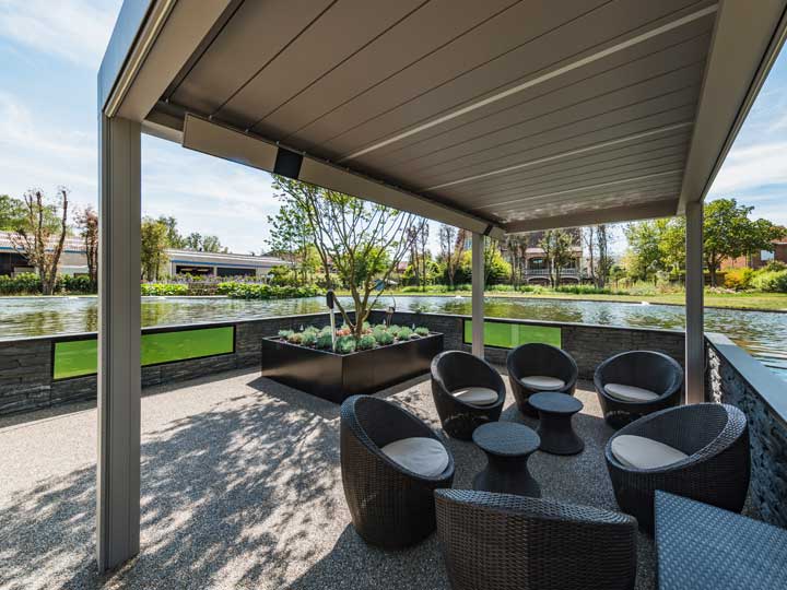 “De Camargue was eigenlijk het eerste waar we allebei aan dachten om dit magische plekje toch de ideale beschutting te kunnen geven,” verklaart Johan Ons de keuze voor het topproduct uit het Outdoor Living assortiment van Renson. “Het lamellendak kan je openen of sluiten naargelang de hoeveelheid zon of schaduw die je wil. Maar het gaat verder dan dat. Want zelfs bij een plotse zomerse regenbui, sluit je gewoon de lamellen en kan je toch op het terras blijven zitten. Om er ook beschut en geborgen te zitten wanneer de wind opsteekt, werden hier optioneel screens in de zijwanden geïntegreerd. Door die te sluiten maak je er een gezellige cocon van, zonder wind als spelbreker. Het maakt dat de eigenaars op zomeravonden langer maar net zo goed ook in het tussenseizoen nog heel wat van hun favoriete plekje ‘in de vijver’ zullen kunnen genieten, zelfs met licht en geluid die eveneens mee in de terrasoverkapping ingewerkt zijn.”