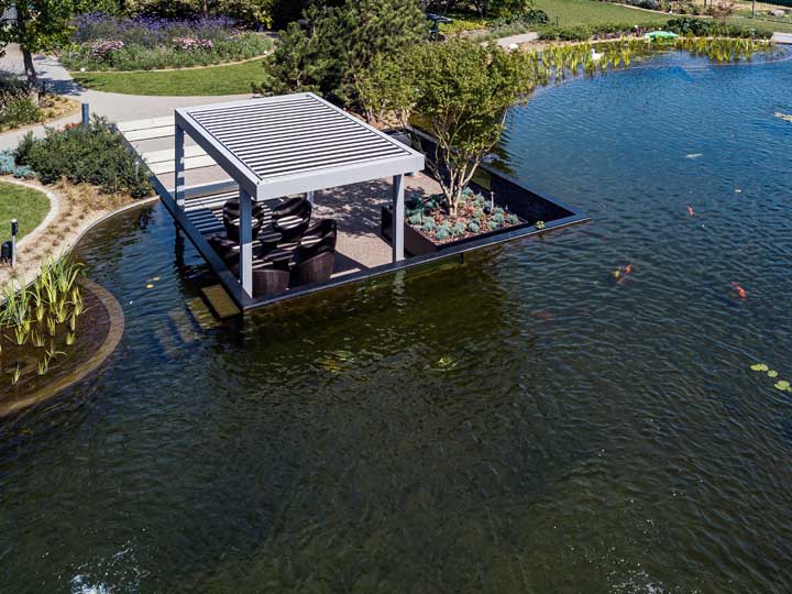 Hoewel dit terras midden het water niet het hoofdterras bij de woning is, is dit toch de plek waar de bewoners het meest vertoeven. Zelfs heel vroeg ’s morgens, om er de vissen te voederen, maar even goed om er tot rust te komen midden de vijver of net in het centrum van de actie te staan met zwemmende of roeiende familieleden en buren in of op het water rond hen. Enige nadeel is dat de zon er vrij spel heeft, want schaduw is er niet meteen in de buurt. En dus kwam bij het ontwerp van de nieuwe tuin de Camargue terrasoverkapping in het vizier.