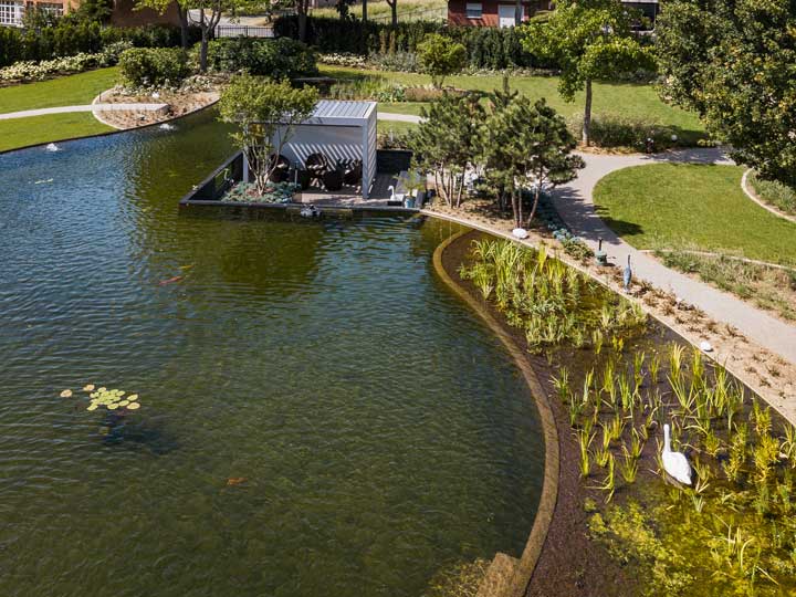 Johan Ons: “Het was de specifieke wens van de eigenaars om vanuit hun terraszetel op ooghoogte te kunnen genieten van het wateroppervlak van de zwemvijver rondom hen. En dus voorzagen we bij het totaalontwerp van hun tuin een zitkuil met terras midden in het water, waarbij ramen in de wanden hen bovendien zelfs een blik gunnen onder het waterniveau. De mosterd haalden we in Limburg waar je in Bokrijk kan ‘fietsen door het water’, met het wateroppervlak links en rechts van je.”