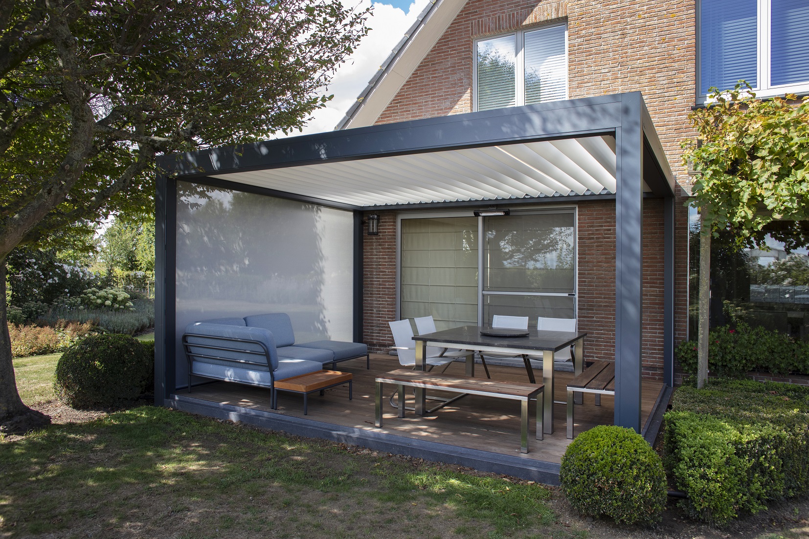 Wil je ook ’s avonds een gezellig etentje buiten houden? Dat kan dankzij extra opties zoals terrasverwarming en sfeerverlichting. Een grote troef van de B250 XL is dat de warmte ’s avonds langer behouden blijft onder de overkapping, omdat het niet kan ontsnappen via de structuur. Wil je daarbovenop je terras extra beschermen tegen wind en zon? Dan kies je best voor geïntegreerde screens. Die zijn mogelijk aan alle zijden en kunnen verdeeld worden met een deurpaal om zo een opening en snelle doorgang te creëren. Creëer tot slot de juiste sfeer dankzij dimbare verlichting zoals led strips in de lamellen of spotjes in de structuur. Heel wat mogelijkheden om je terras naar jouw hand te zetten!