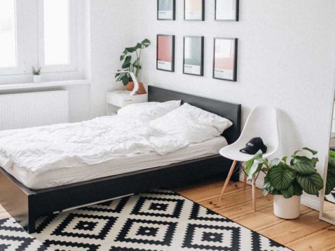 In het geval je net een nieuw huis hebt gekocht of je slaapkamer in je huidige huis volledig leeg hebt gehaald, zou je ervoor kunnen kiezen om tapijt neer te leggen. Ga bijvoorbeeld voor een extra zacht materiaal, zodat je nooit meer koude voeten zult hebben als je rondloopt zonder sokken of pantoffels. Een simpelere oplossing is het aanschaffen van een vloerkleed. Zoek een mooi exemplaar uit in je lievelingskleur en met de juiste afmetingen, en plaats een kleine versie aan het voeteneinde of een grote variant volledig onder je bed.