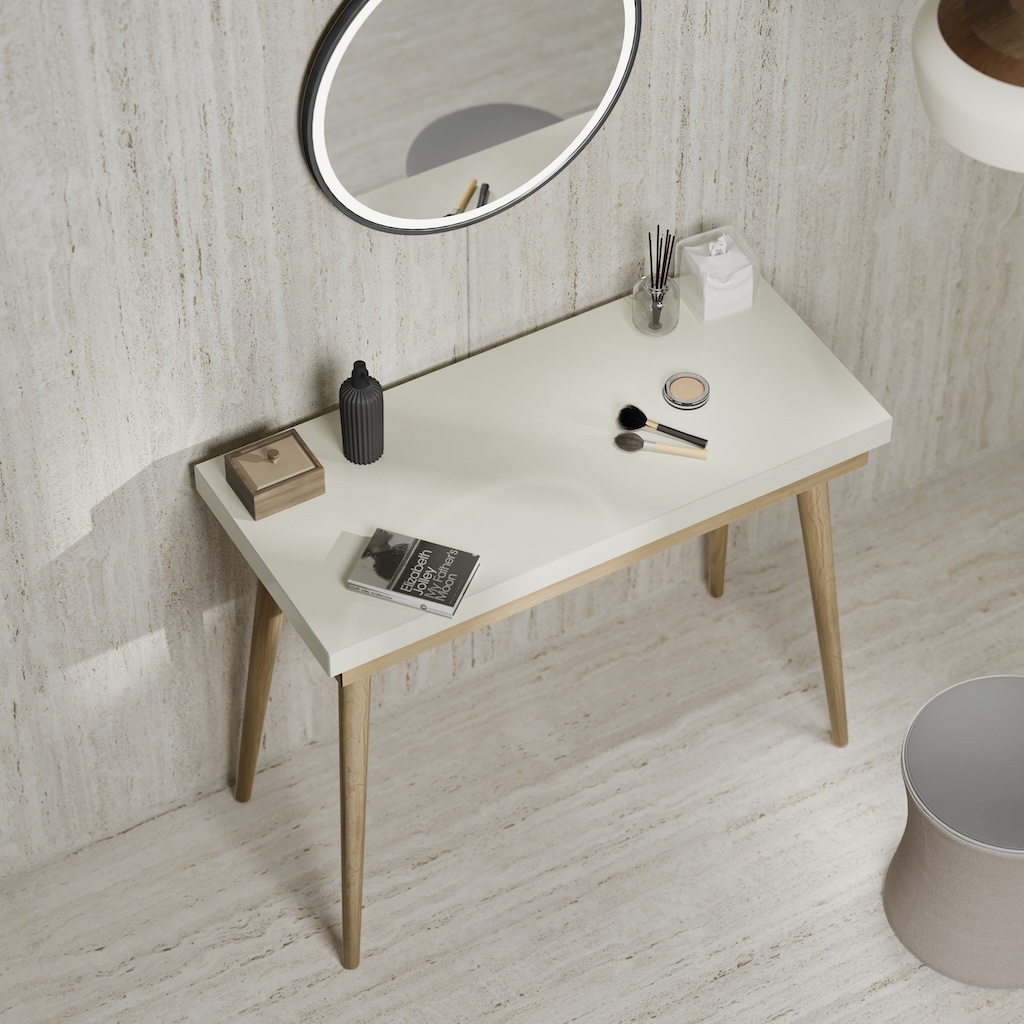 Het blad van zo’n beauty tafel moet niet alleen mooi zijn maar ook gebruiksvriendelijk en gemakkelijk te reinigen. Dekton en Silestone van Cosentino vormen dé oplossing. Beide producten zijn leverbaar in vele kleuren van een lichte carrera marmer tot een diepe donkere granietachtige tint. Het is zelfs bestand tegen nagellak of andere make-up vlekken en ook remover tast het Dekton niet aan.