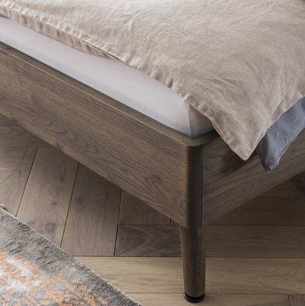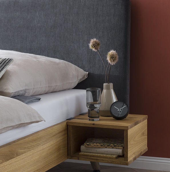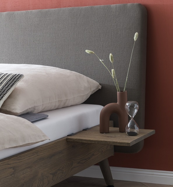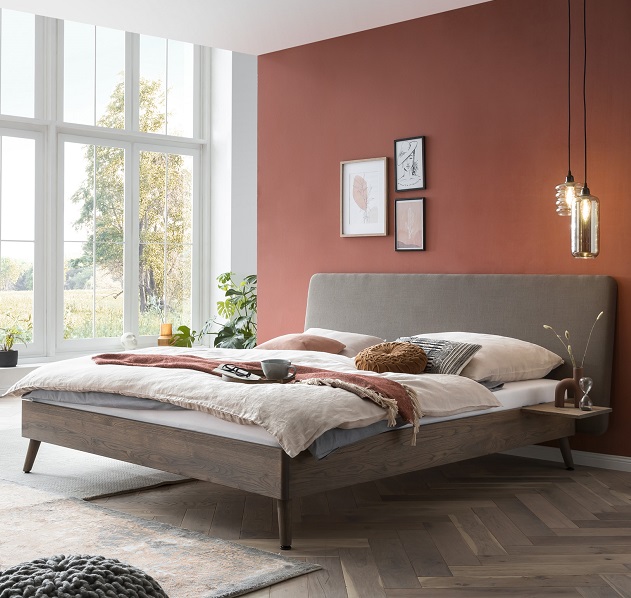 Massief eiken houten bed met gestoffeerd hoofdbord