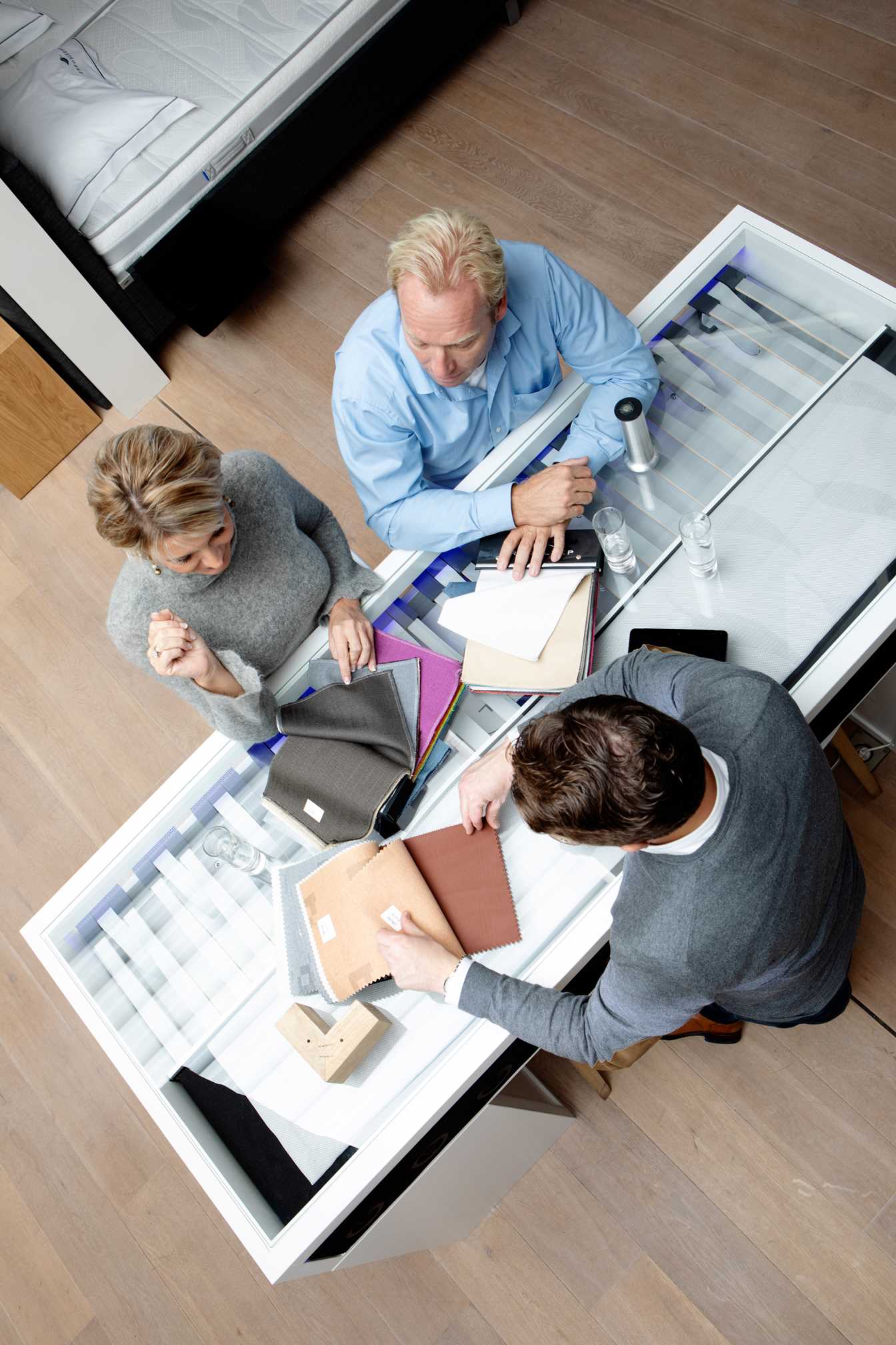 De klant zal niet de eerste zijn die het jammer vindt dat de beleving hier eindigt. Hij/zij krijgt een document met daarop zijn/haar SLAAP-DNA® en een gefundeerd advies. Aan de hand daarvan kan de klant zijn/haar bed samenstellen: een lattenbodem of een boxspring, het type matras, het hoofdkussen, enz. En ook de aankleding van het bed kan de klant op zijn/haar eigen smaak afstemmen door een persoonlijke keuze uit het brede gamma hoofdborden, stoffen, pootjes en toebehoren. Zo kan zijn/haar bed, van binnen én van buiten, helemaal aan zijn/haar smaak worden aangepast.