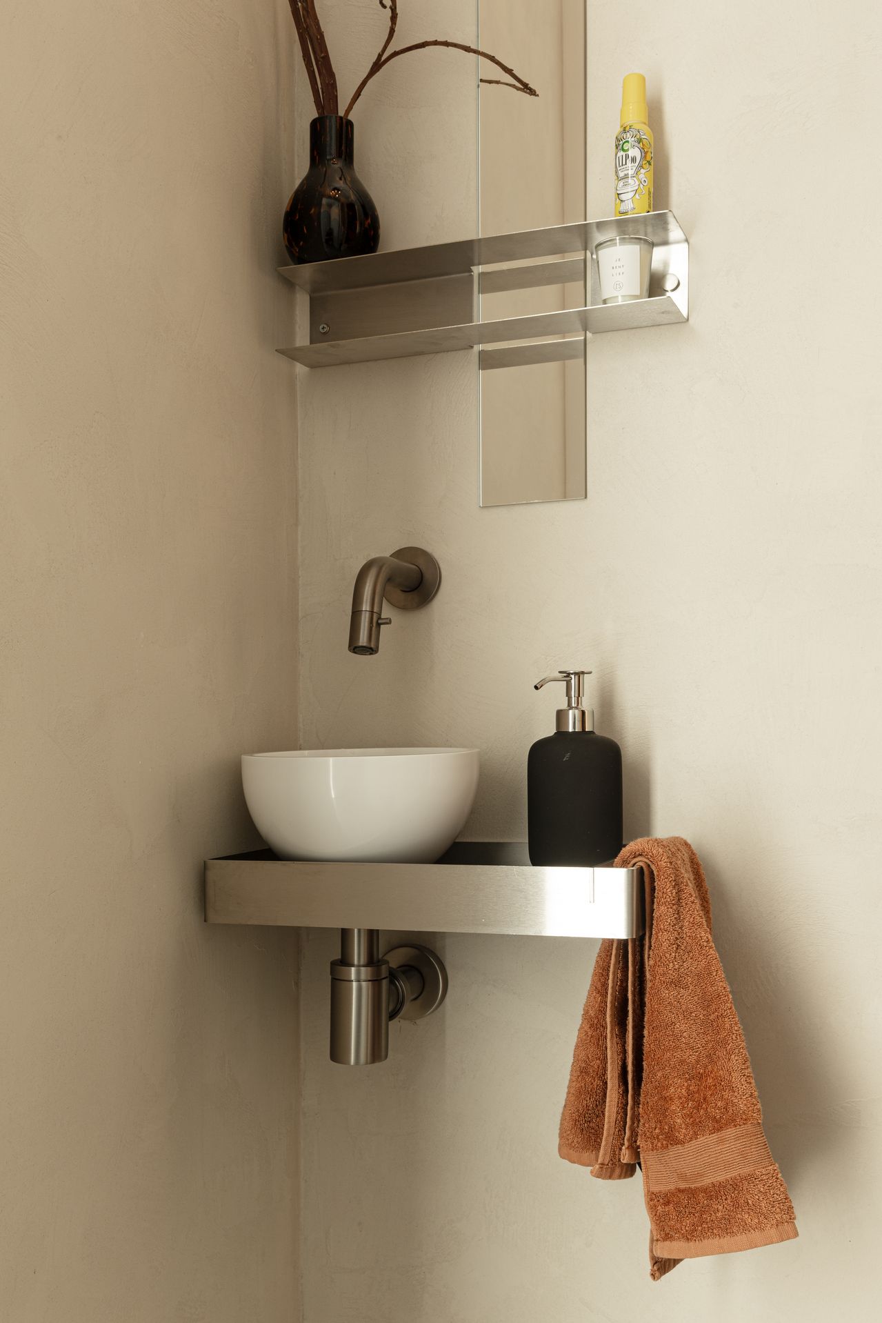 Door beton en beton ciré in de badkamer te combineren ontstaat er een naadloos design en een serene uitstraling. In dit project hebben we op de vloer beton toegepast en is er op de wanden, de ingebouwde kast én het wastafelmeubel gekozen voor beton ciré.