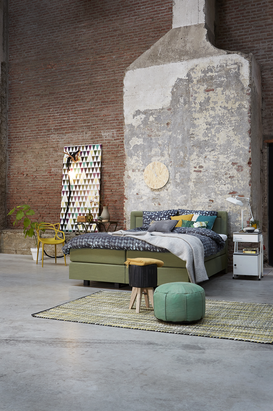 Afgebeeld is een boxspring met hoofdbord Andante in de stof Adore 158 Niagara.