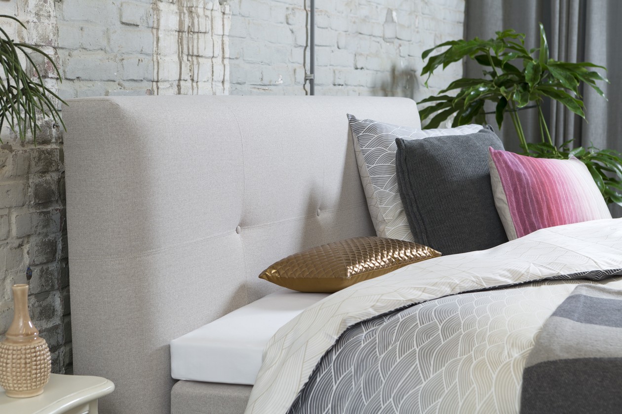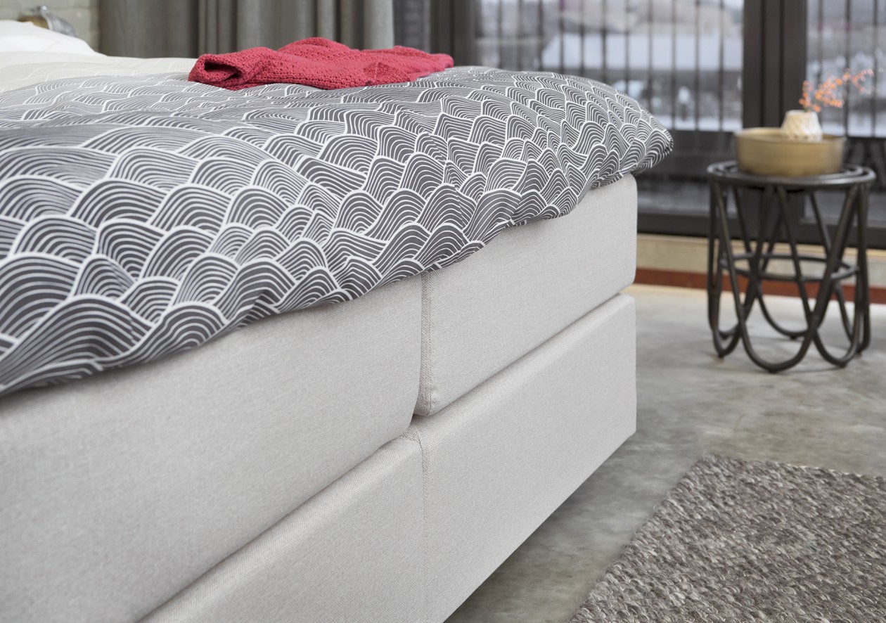 Afgebeeld is een boxspring met hoofdbord Adagio in de stofkleur Board 01 Naturel.