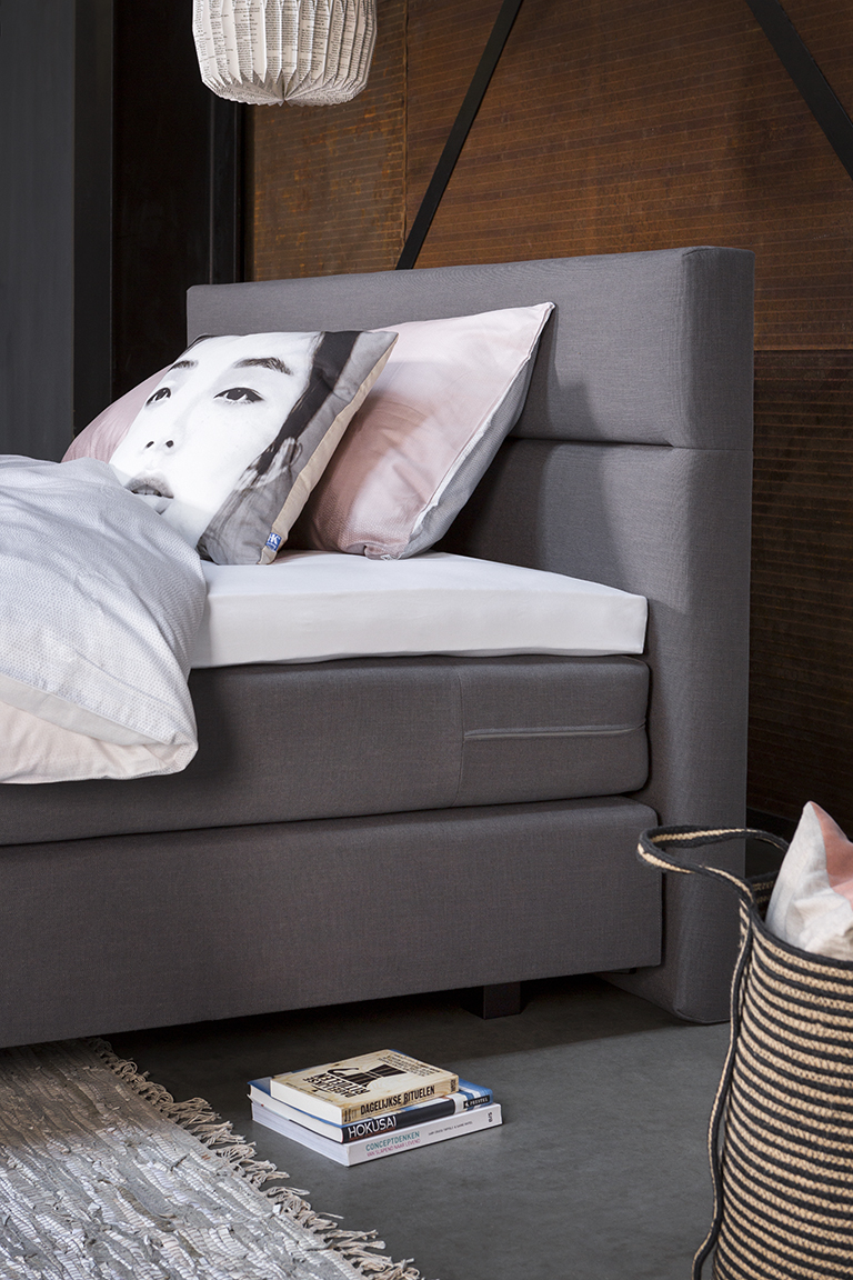 Afgebeeld is een boxspring met hoofdbord Lento in de stofkleur Gapp 65 Grey in combinatie met Crush 67 Antraciet.