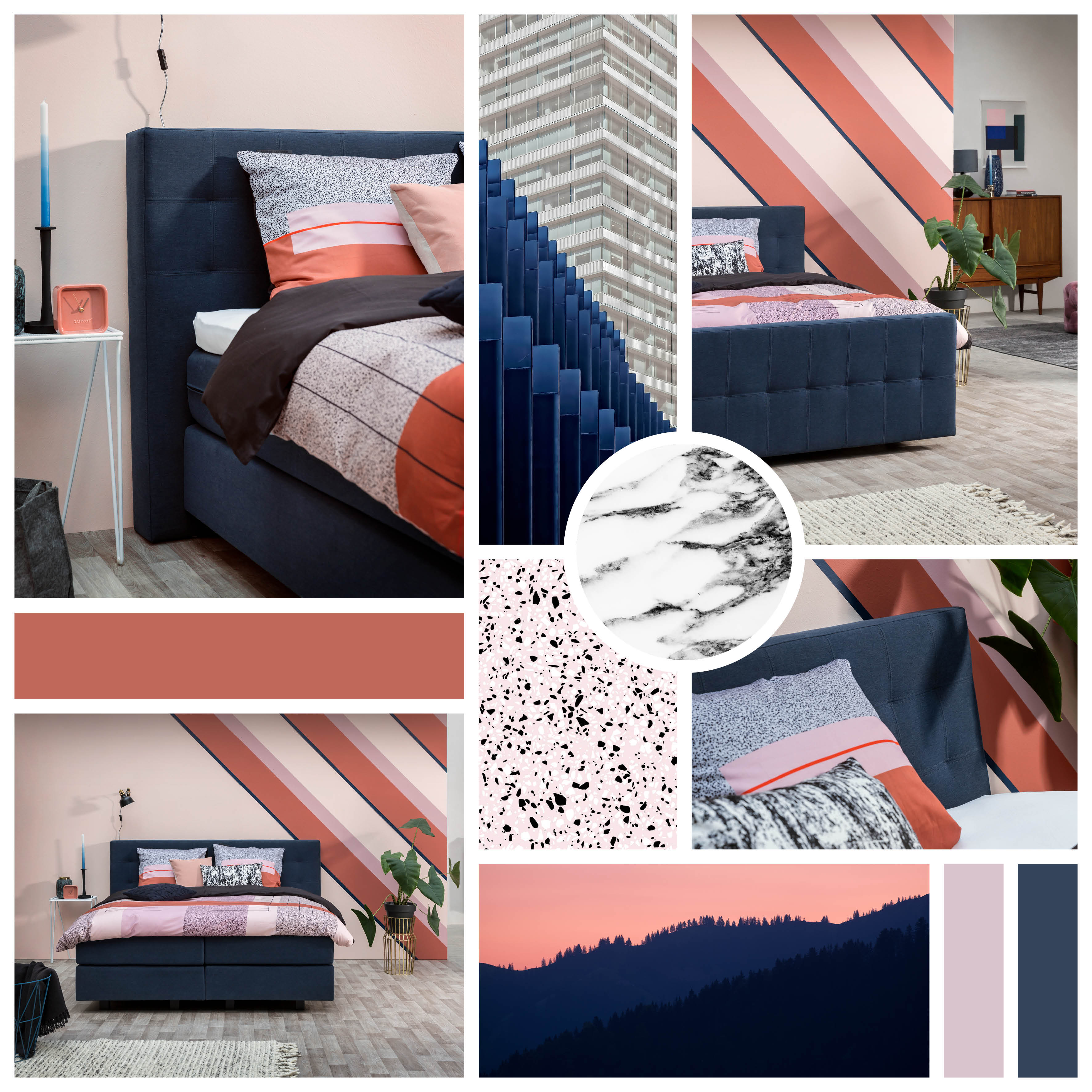 Afgebeeld is een boxspring met hoofdbord Andante in de stof Adore 158 Niagara.