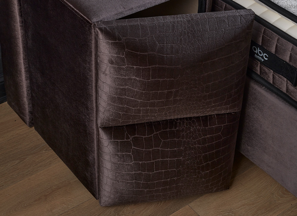 Deze boxspring is een moderne en elegante boxspring combinatie met opbergruimte, uitgevoerd in een mooi geblokt design in de kleur bruin