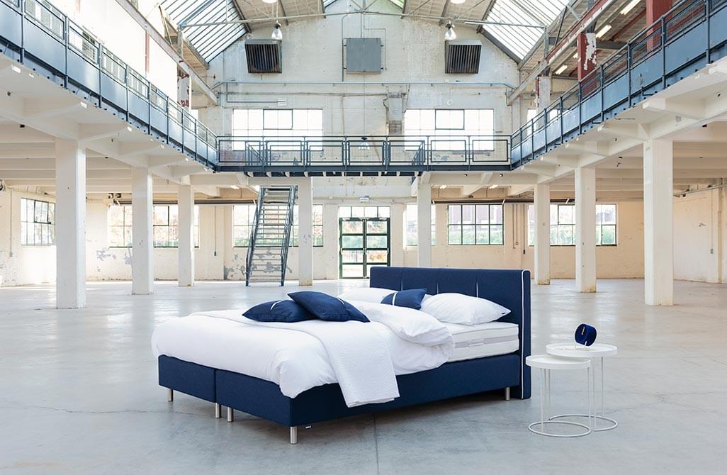 Deze stoere boxspring Topaas van Eastborn in de kleur Sparkling Navi is een echte eye catcher in de slaapkamer.