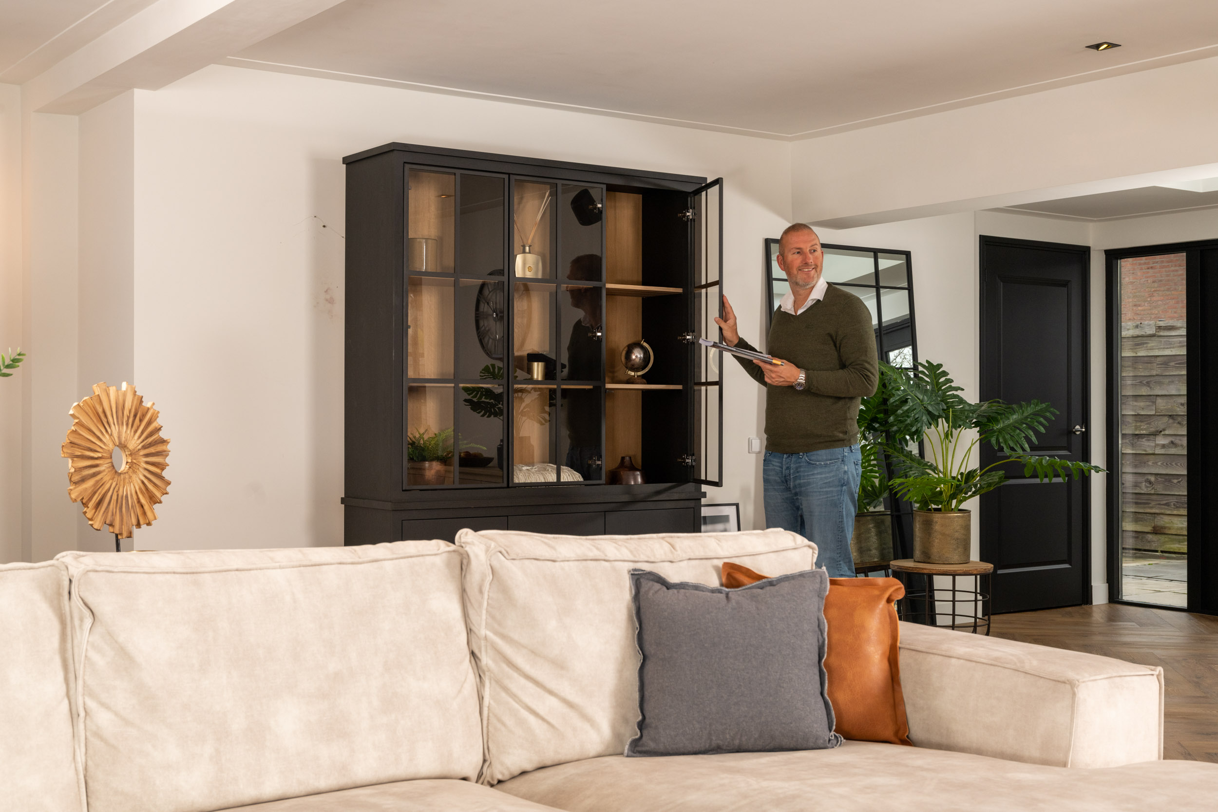 Een stoere maar zeker ook chique meubelcollectie, Vitrinekasten voorzien van (glas) deuren met een zwart metalen kader.