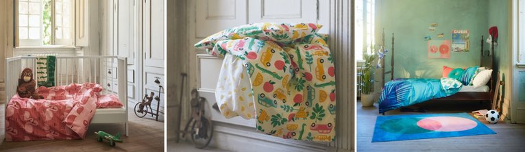 Ook kinderen kunnen deze zomer onder textiel met tropische prints kruipen. In de babykamer sieren flamingo's en lachende krokodillen de RÖRANDE dekens, handdoeken en lakens. Speciaal voor de wat oudere kinderen ontwierpen de designers de collectie GRACIÖS: een turquoise dekbedovertrek met wuivende palmbladeren, een zacht vloerkleed met grafische vormen en fluwelen kussentjes. In lijn met het streven van IKEA om zo min mogelijk plastic verpakkingsmateriaal te gebruiken, zijn de GRACIÖS producten verpakt in katoenen tassen of papieren dozen.