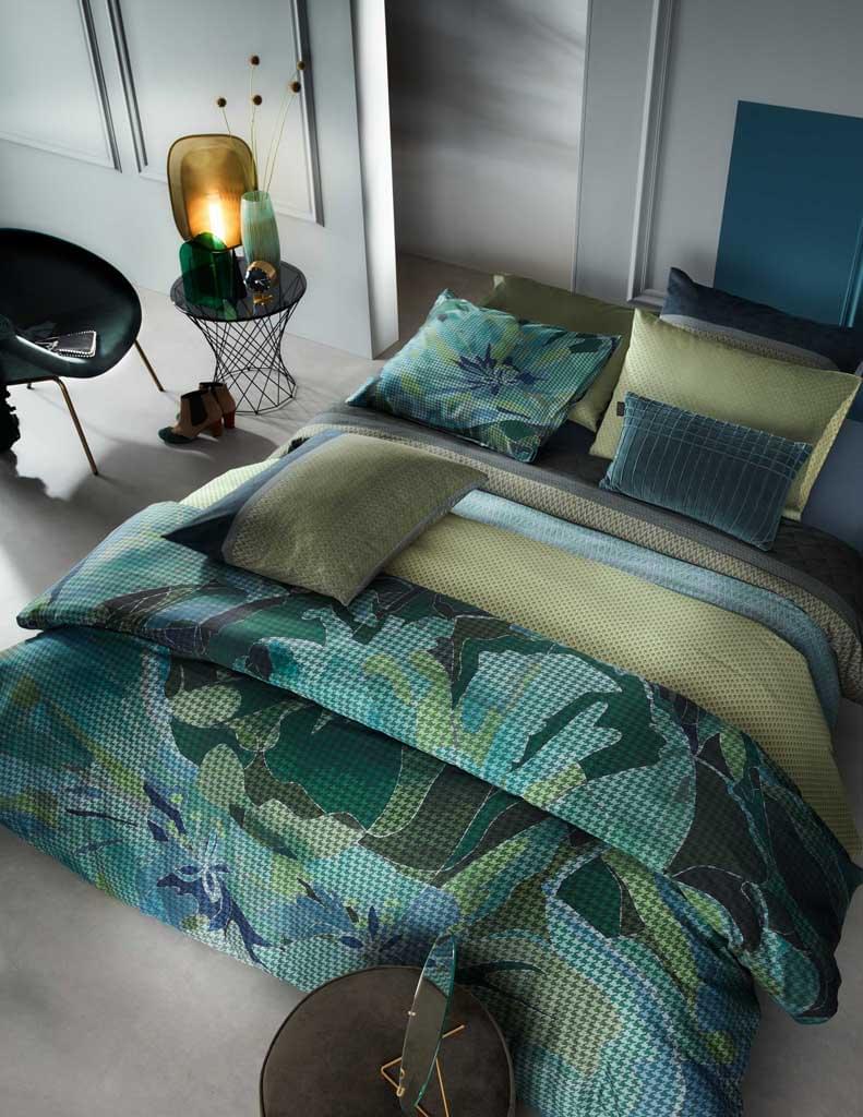 Het dessin van dekbedovertrek Enlighted Green toont een mooi geprinte weefstructuur van een pied de coq motief. Het bijzondere ontwerp van grafisch getekende bloemen, die uitvergroot zijn en met de hand zijn ingekleurd, geeft dit dessin een uniek karakter. De kleuren blauw, zachtgroen, diepgroen en zachte geel accenten maken het dessin af. De achterzijde van dekbedovertrek Enlighted is uitgevoerd in effen groen.