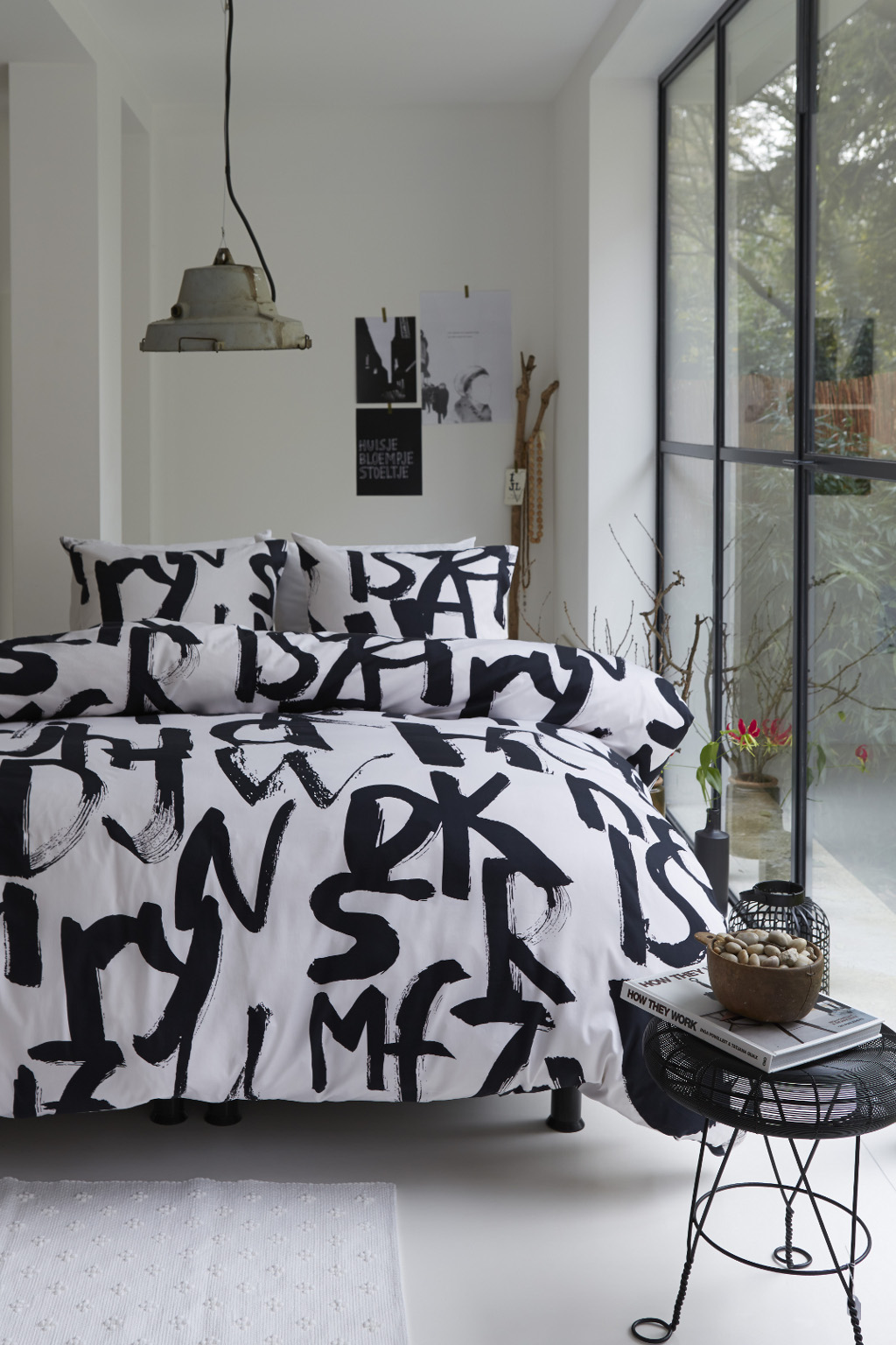 Bedtextiel dessin 'Queenstown' bestaat uit handgeschilderde opgeblazen letters, welke op een abstracte manier door elkaar gemixt zijn. Hierdoor is een eigenwijs patroon ontstaan. Door de zwart/witte combinatie helemaal in de modekleur van nu.