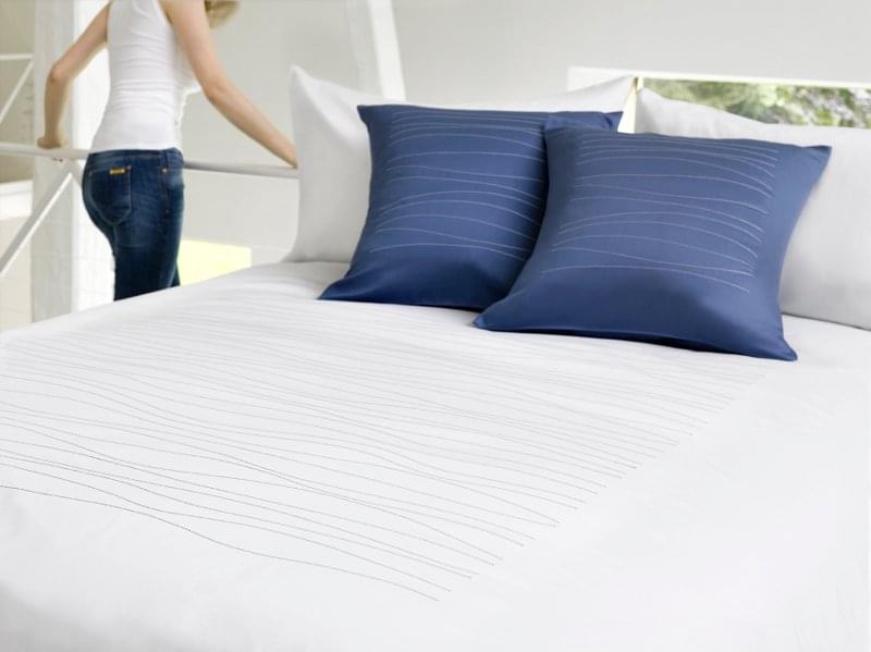 Mirabel voelde zich al langer geïnspireerd door de glooiende golven van zacht deinend water… Met de hulp van een nieuw programma op de borduurmachine tovert Mirabel een prachtig lijnenspel op de dekbedovertrekken en kussenslopen van de Carvi-collectie. Ook hier kies je zelf in welke kleur de lijntjes geborduurd worden… en dat op de stoftint die het best bij jouw interieur past.