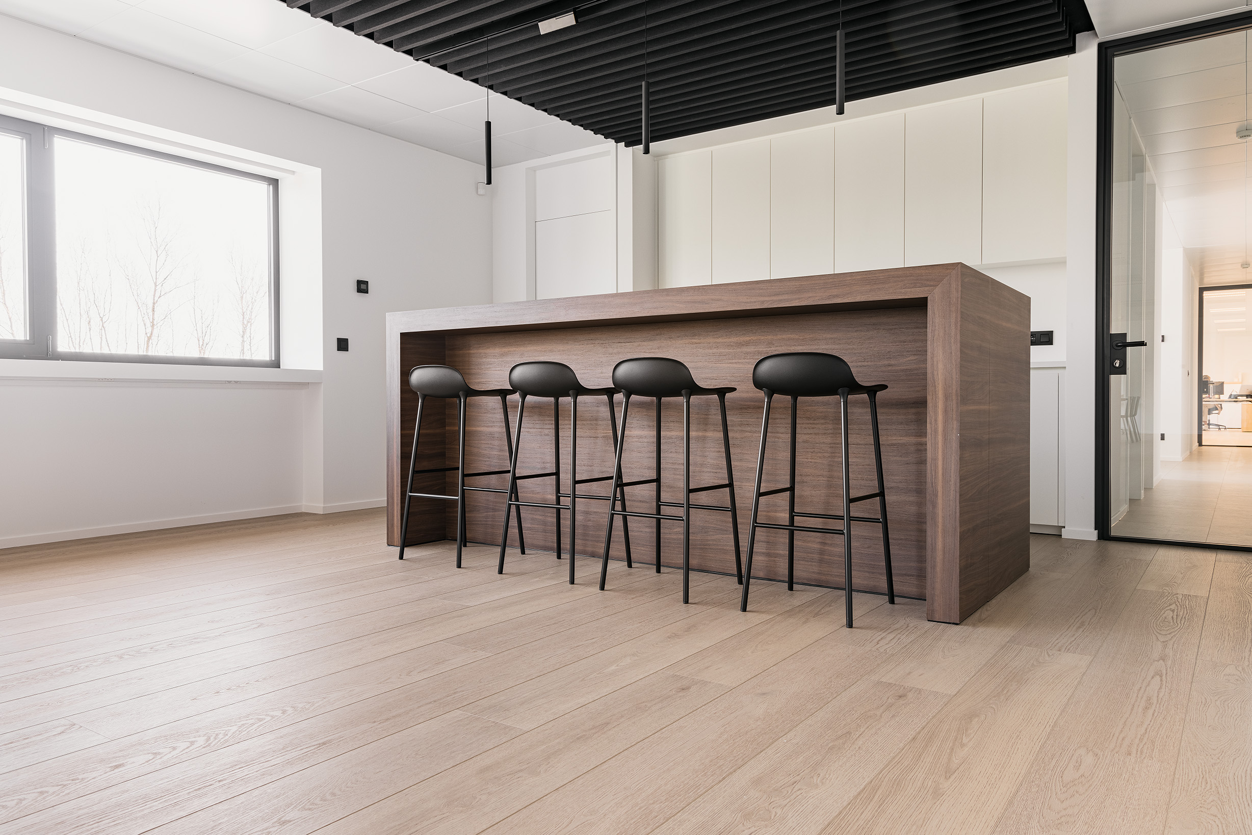 “We werkten met een interieurarchitect, maar ik wist al wat ik graag zag”, zegt Sabine. De plankenvloer is er een uit de Naturals-collectie, waar de natuur de hoofdrol speelt. TopTalents koos in de ontvangstruimtes voor de levensechte look van hout. Ook de ‘touch’ is echt: het reliëf van de planken volgt exact het patroon van de nerven. Je voelt dus wat je ziet. En je ziet wat je voelt.