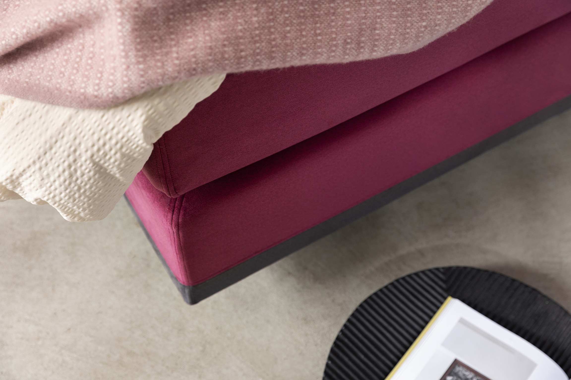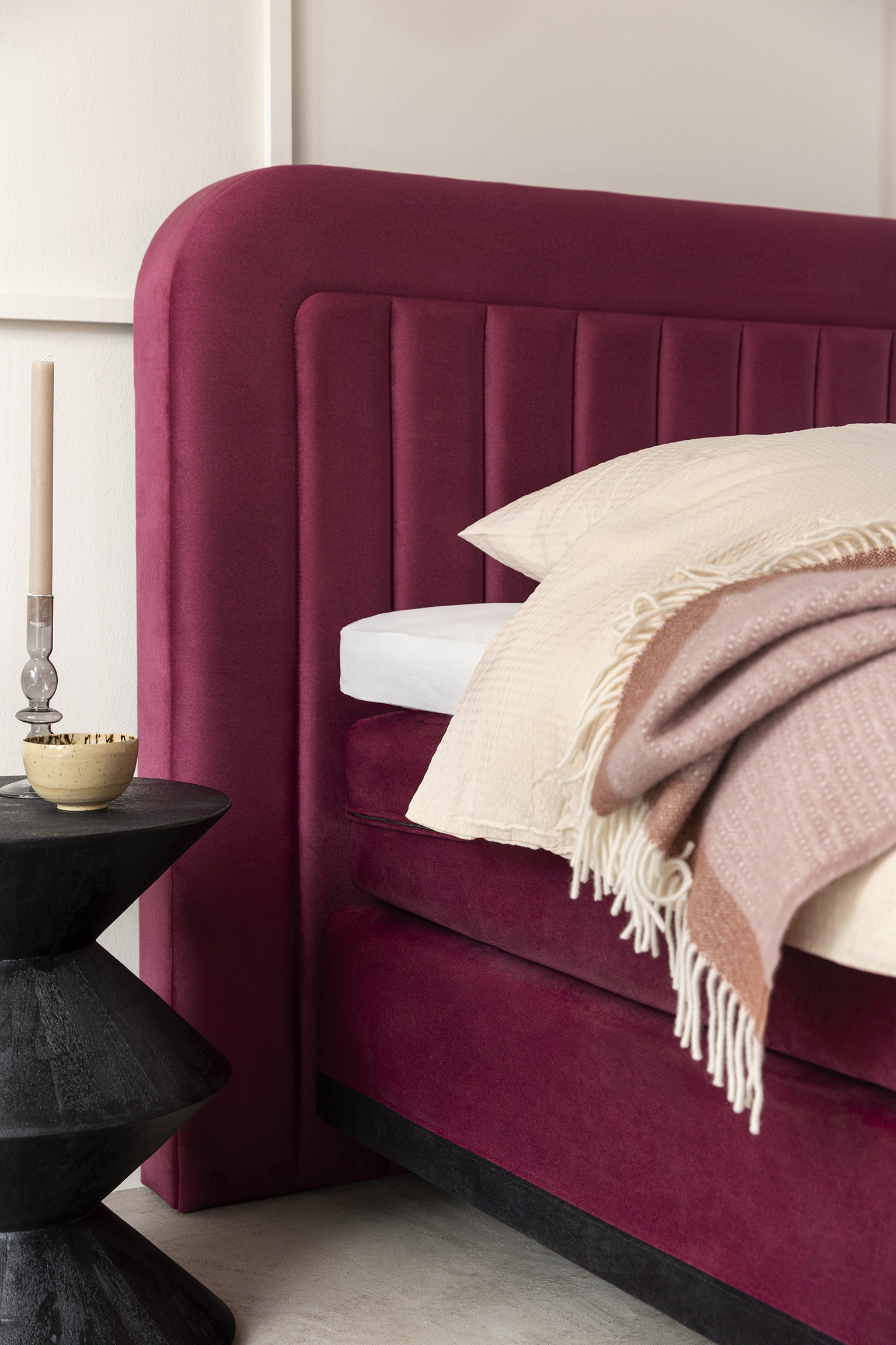 Afgebeeld is een boxspring met hoofdbord Stretto in de stofkleur 019 Burgundy.www.hmlbedding.nl