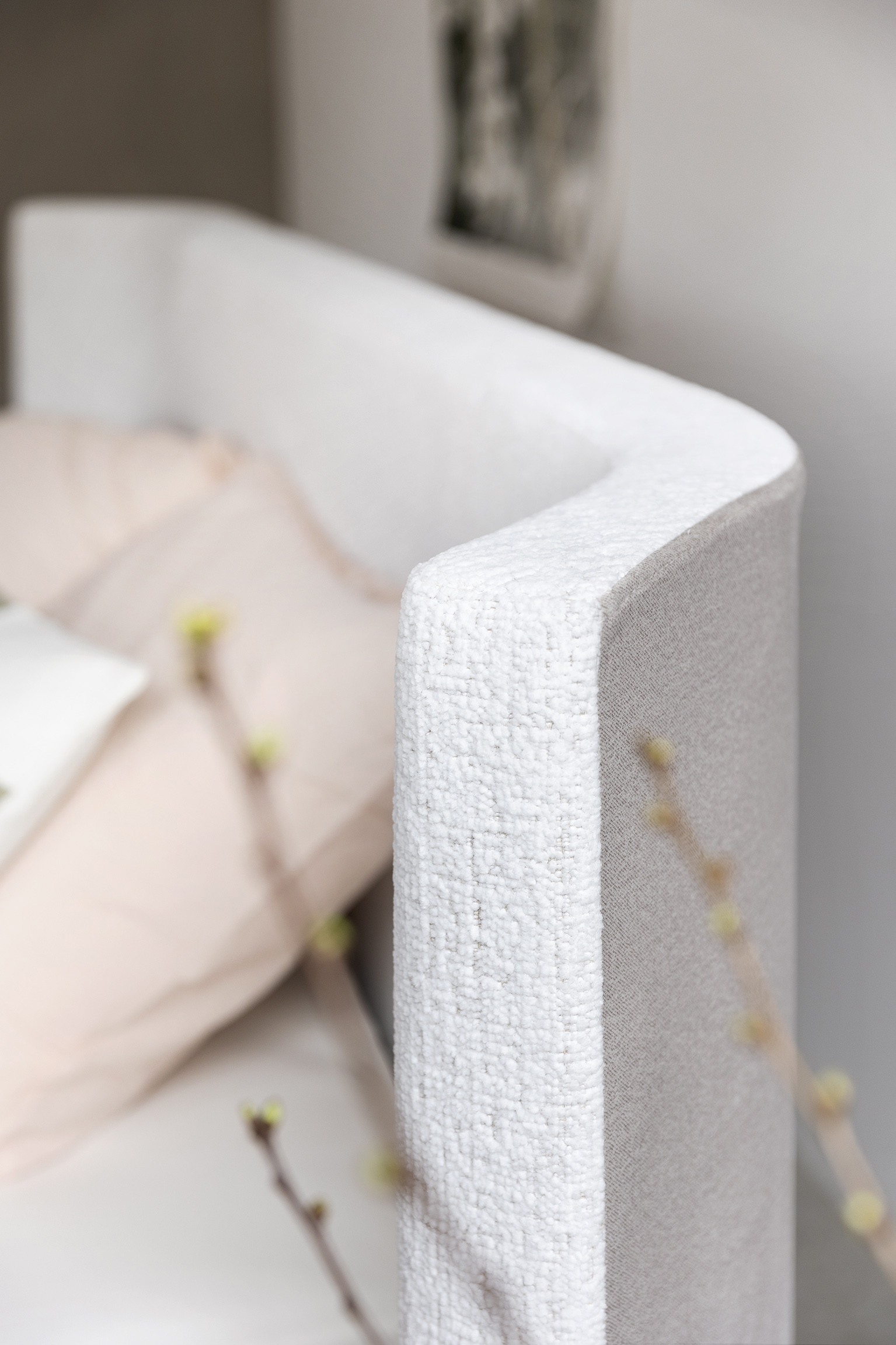 Afgebeeld is een boxspring met hoofdbord Poco in de stofkleur 101 Ivory in combinatie met 017 Magnolia.www.hmlbedding.nl