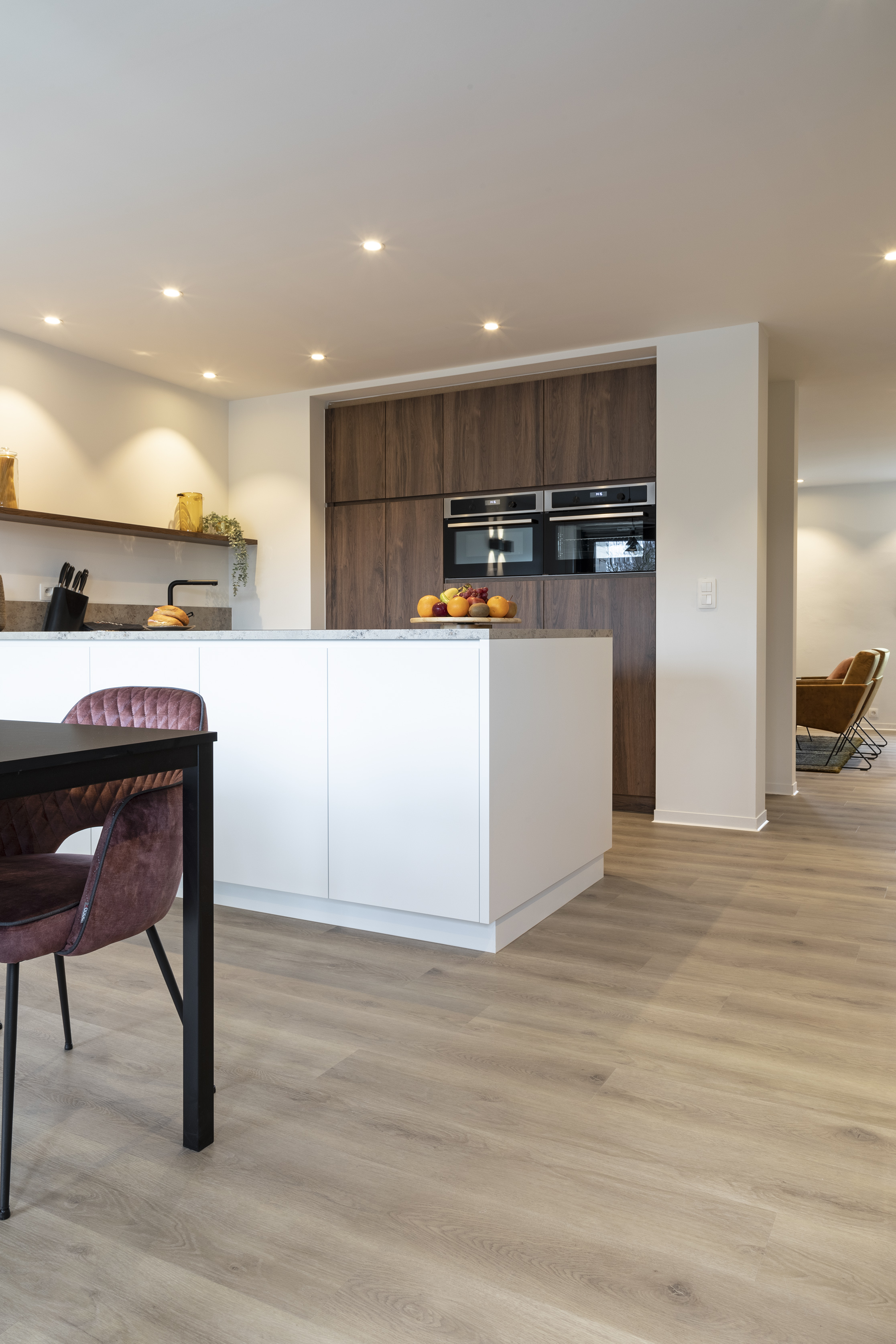 Deze look is een van mijn favorieten: het geeft veel sfeer mee aan de ruimte. En het is weer eens wat anders dan eikenhout, wat je al in heel veel andere woningen ziet terugkomen.” Ocala Walnut 87 zorgt voor een warme uitstraling in de woning van Tine en Marijke.