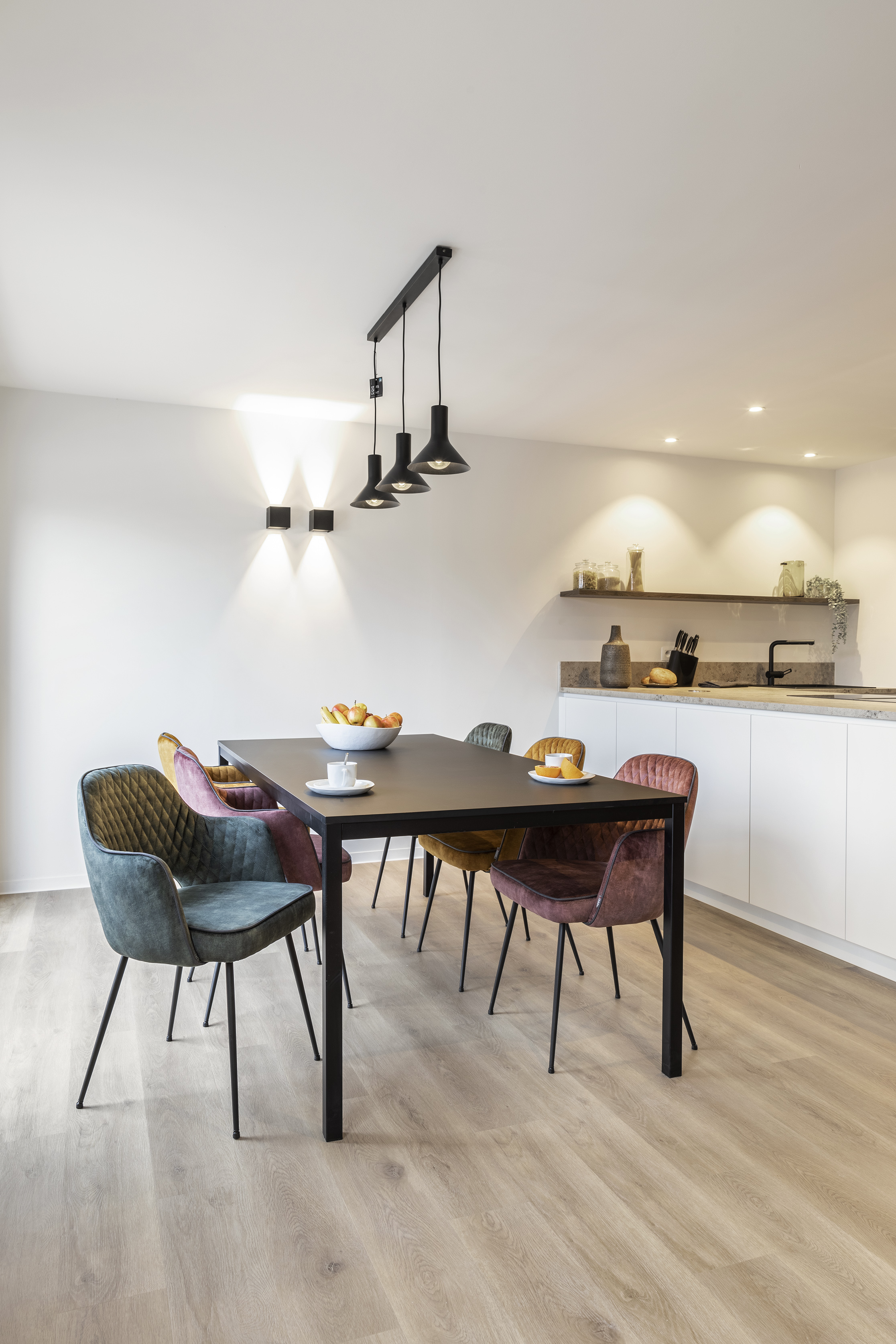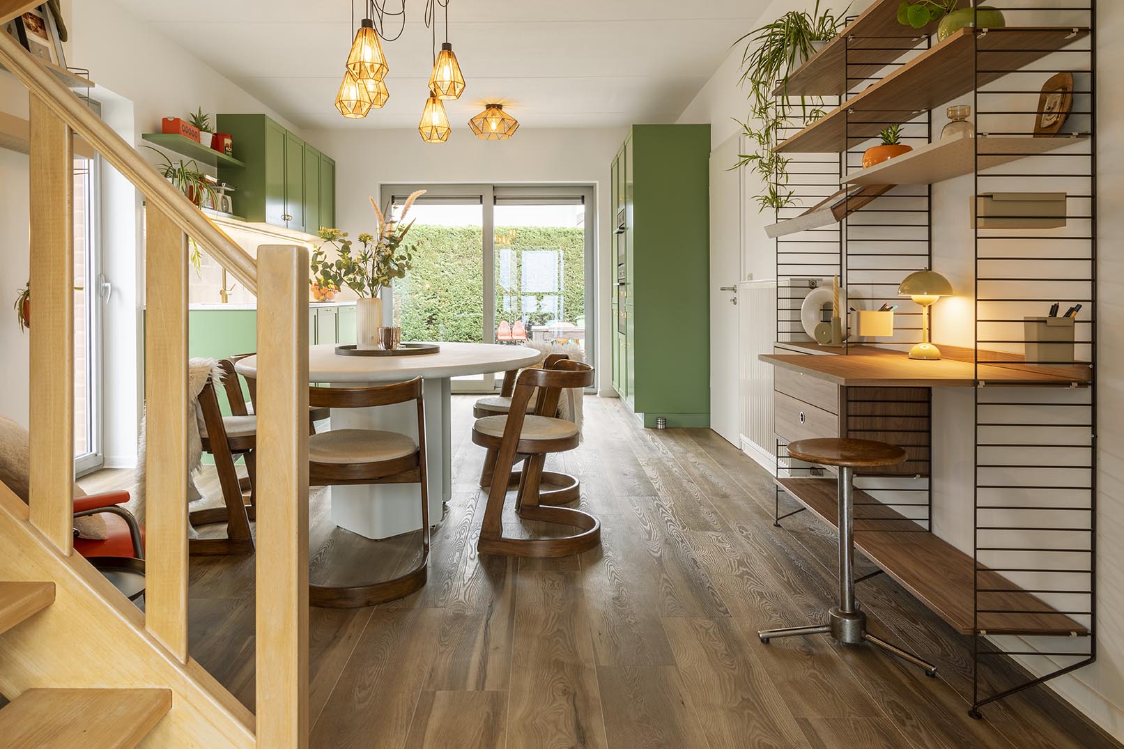 “De woning in Heist-op-den-Berg, van Tine en Marijke. De moeilijkste ruimte om in te richten was de keuken/eetkamer. Tine en Marijke wilden een interieur met eclectische uitstraling, waar hun tweedehands- en nieuwe spullen mooi bij elkaar passen. Het was een uitdaging om daar een geschikte vloer bij te kiezen, maar uiteindelijk koos ik voor Ocala Walnut, een vloer met een prachtige notelaarslook.