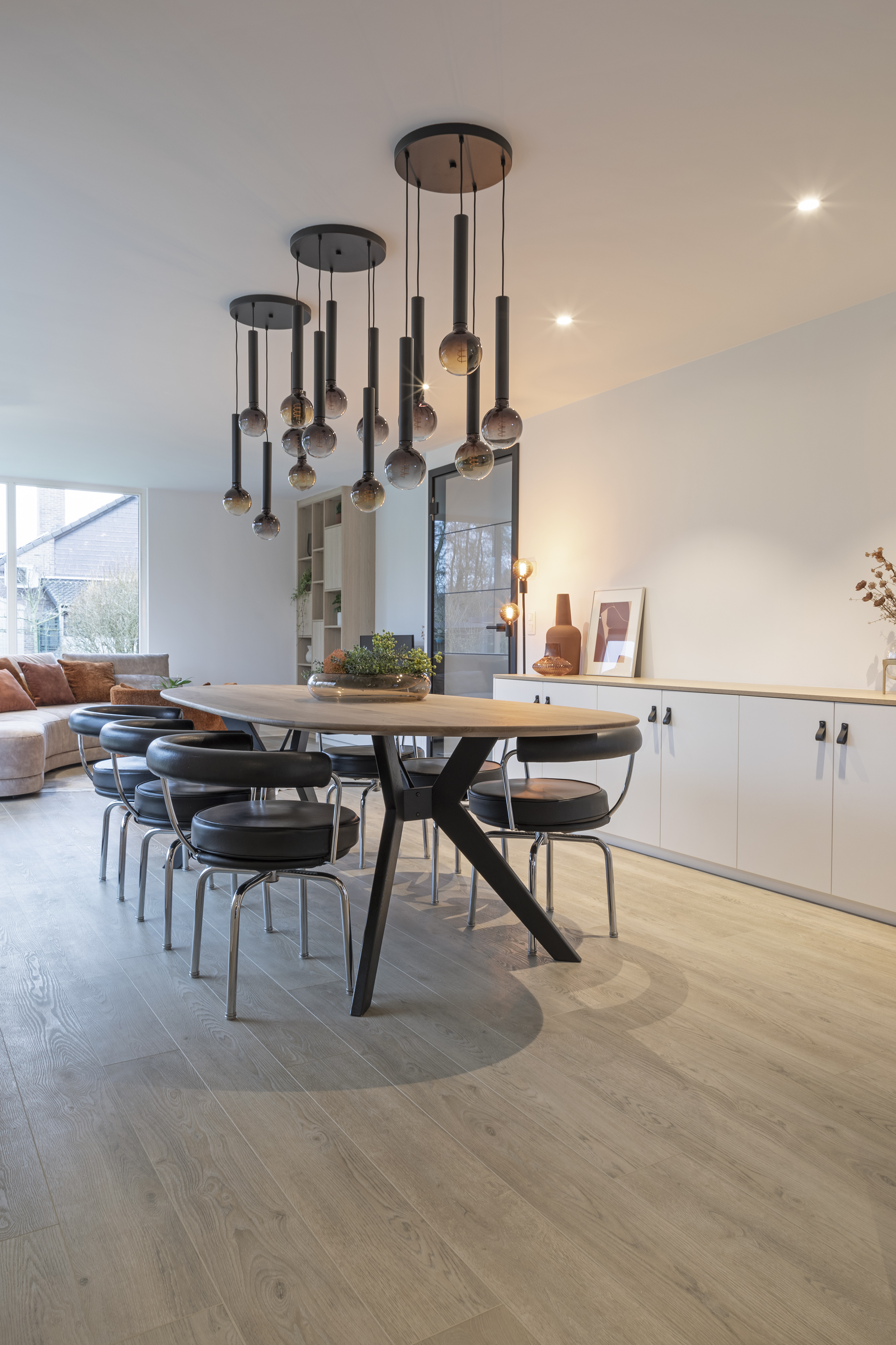 “Jazeker, dit was echt een totaalrenovatie. Van de garage tot aan de keuken, en van de hal tot aan de slaapkamers: in elke ruimte legden we een nieuwe vloer. De vloeropbouw in deze woning was goed, dus de vakmannen hoefden de ondervloer niet de egaliseren. In de meeste ruimtes legden we de nieuwe vloer direct over de oude heen.”