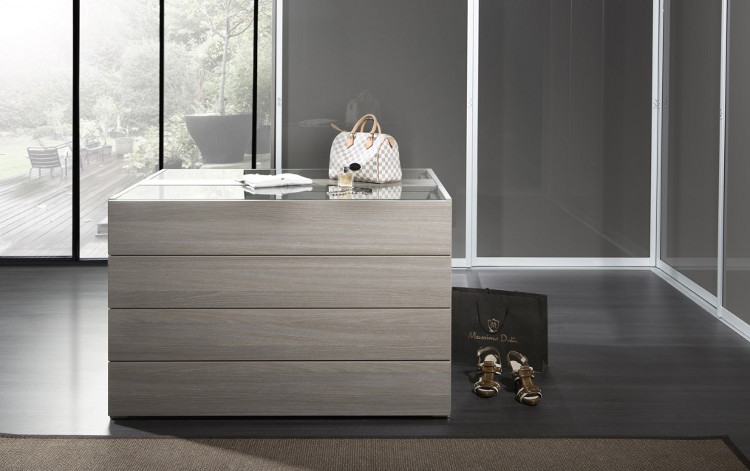 Dress-in is een tweezijdig vrijstaand eiland met een gesloten bovenkant. Het topblad is verkrijgbaar in variabele diktes en kan van een gelakte glasplaat worden voorzien. Dress-up heeft een open bovenkant die eveneens met een glasplaat kan worden afgedekt. In het vak onder de glasplaat kan een legplank of een lade worden geplaatst. Zo is de inhoud van de lade zichtbaar door de glasplaat. Dat geeft een fraai en speels effect, bijvoorbeeld bij een aluminium vakindeling en een stoffen inleg.
